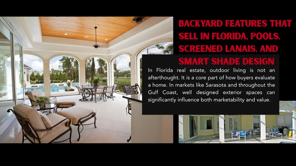 In Florida real estate, outdoor living is not an afterthought. It is a core part of how buyers evaluate a home. In markets like Sarasota and throughout the Gulf Coast, well designed exterior spaces can significantly influence both marketability and value.