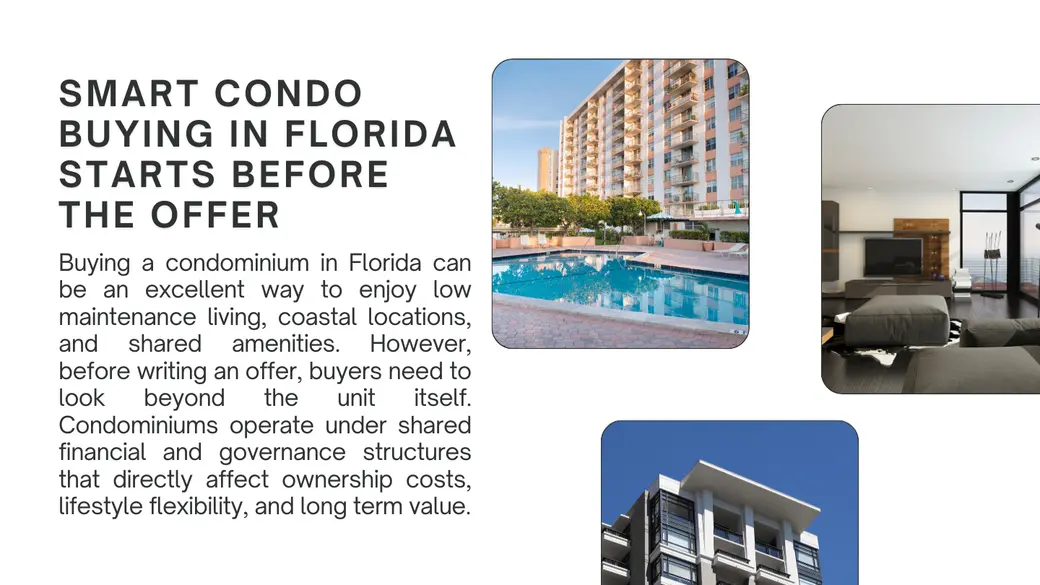 Buying a condominium in Florida can be a great way to enjoy low-maintenance living, coastal locations, and shared amenities. But smart condo buying starts before you ever write an offer, because condos come with shared financial, legal, and building responsibilities that can impact your monthly costs, your rental flexibility, and your long-term value.