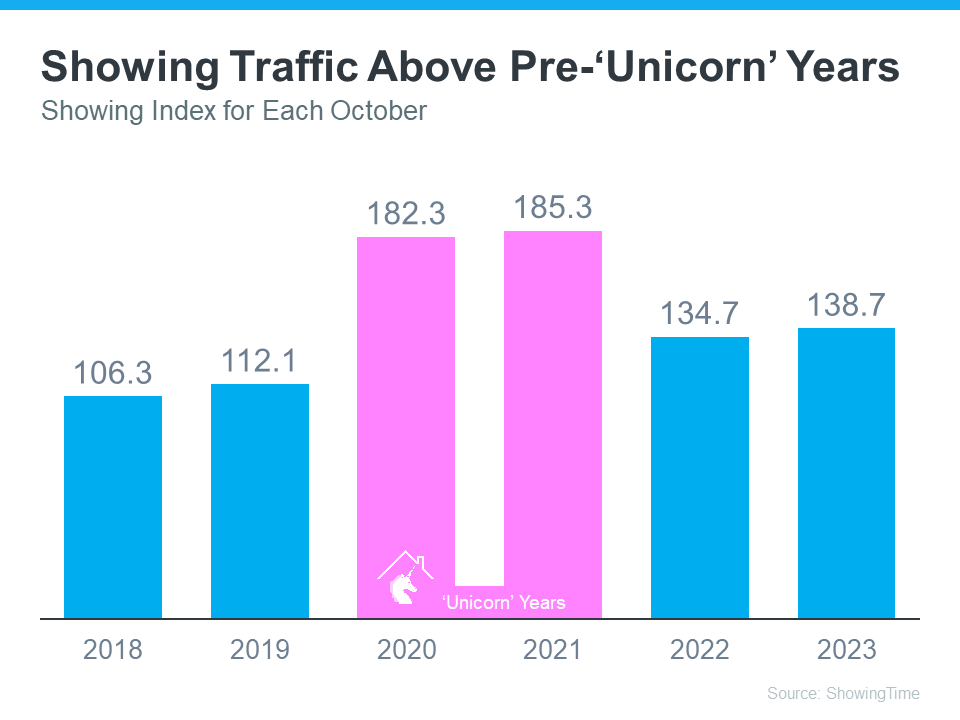 In the graph, the ‘unicorn’ years are shown in pink. You can see demand has dipped some since then. That’s in response to higher mortgage rates. But, when you compare 2023 to the blue bars on the left that represent the last normal years in the market (2018-2019), you can tell buyers are still more active than the norm.